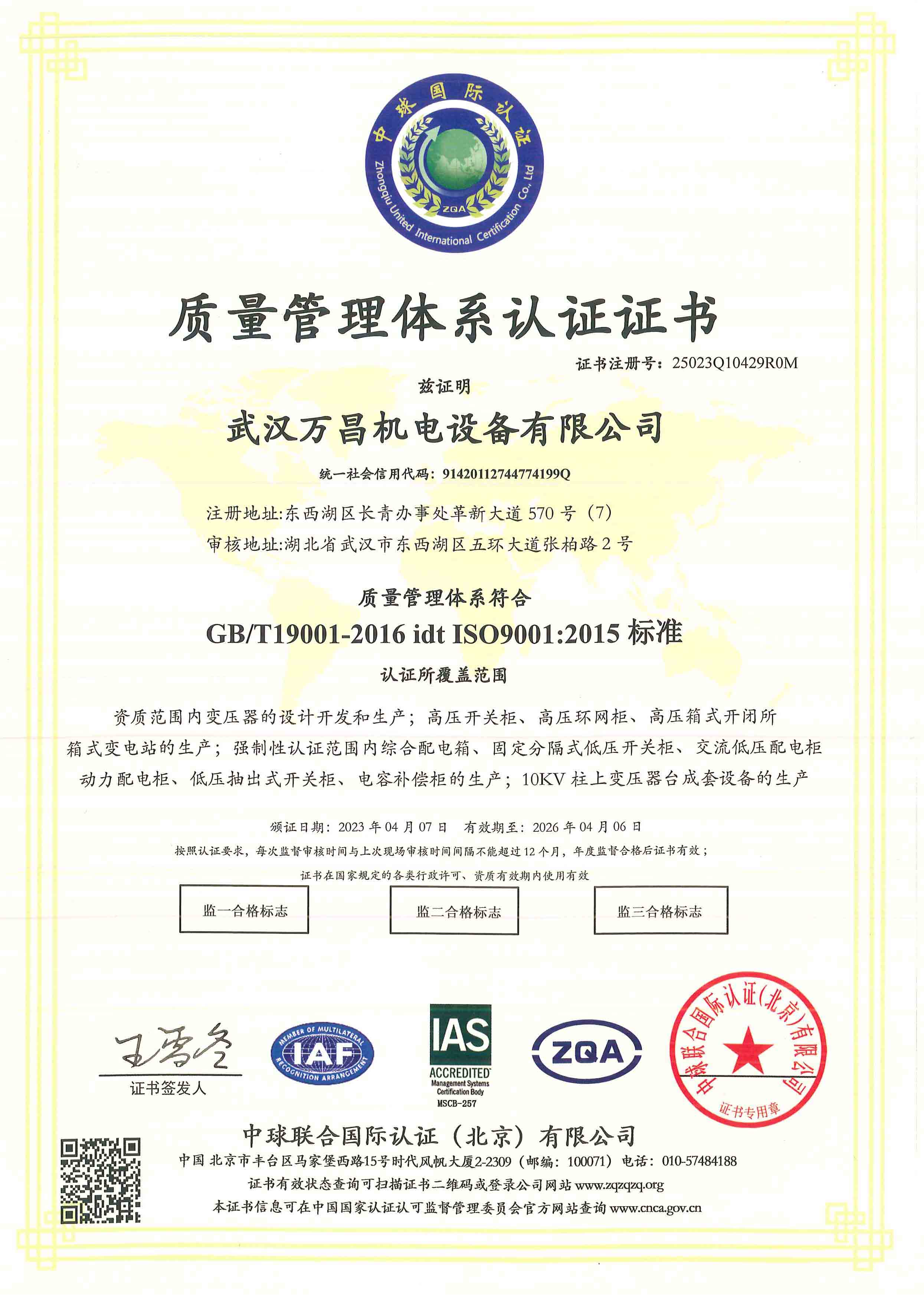 質(zhì)量管理體系認證證書